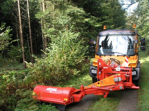 Die Uni-Seitenmäher der Baureihe SMK arbeiten als Frontgerät seitlich neben dem Trägerfahrzeug in der Dreipunkthydraulik Kat. II oder in der Fahrzeugplatte Gr. 3 oder 5. Die Geräte sind für Links- oder Rechtsarbeit lieferbar. Die Arbeitsbreite beträgt 1,50 m oder 1,80 m.